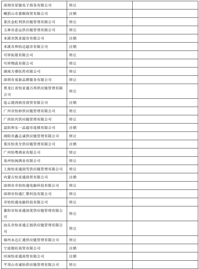 大家都注意到,近三年來(lái),怡亞通頻繁轉(zhuǎn)讓或注銷公司,比如化妝品、超市、商貿(mào)以及供應(yīng)鏈公司,涉及企業(yè)數(shù)量多達(dá)85家,如河南怡亞通化妝品有限公司、湖南怡亞通梧桐國(guó)際美妝有限公司、江西怡亞通國(guó)際美妝有限公司等均已被注銷。