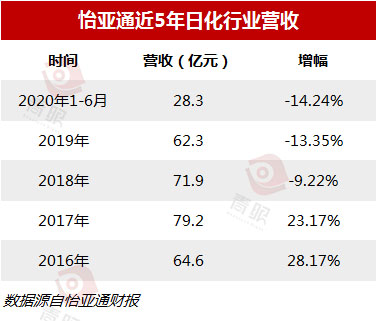 狂攬全國(guó)各地知名化妝品代理商,2016-2017年怡亞通的日化業(yè)務(wù)交上了一份亮眼成績(jī)單。財(cái)報(bào)顯示,2017年怡亞通日化業(yè)務(wù)營(yíng)收達(dá)79.2億元,同比增長(zhǎng)23.17%。而這,也成為了怡亞通日化業(yè)績(jī)的高光時(shí)刻,此后幾年收入連年萎縮,2019年其日化收入已倒退至2016年的水平。