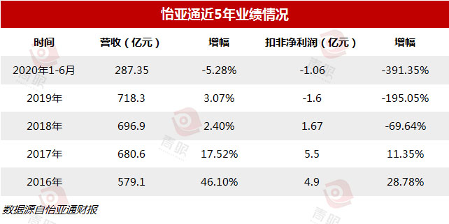 2017年是怡亞通成立的第20個(gè)年頭,這一年公司營(yíng)收達(dá)680.6億元,延續(xù)了上一年的增長(zhǎng)勢(shì)頭,此時(shí)的扣非凈利潤(rùn)也比較穩(wěn)健,同比增長(zhǎng)11.35%。然而,2018年至今,公司業(yè)績(jī)可謂是每況愈下,2019年和今年上半年扣非凈利潤(rùn)均為負(fù)值。這一業(yè)績(jī)逆轉(zhuǎn)與上述日化業(yè)務(wù)、380分銷平臺(tái)業(yè)務(wù)收入的變化恰好吻合。