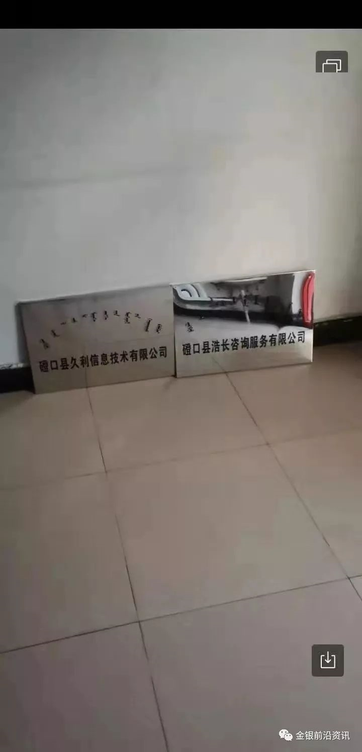 空曠的房間里,孤獨的擺放著兩個牌子“磴口縣久利信息技術(shù)有限公司” 和“磴口縣浩長咨詢服務(wù)有限公司”,如同被遺棄。詢問房東一番,得知該房屋為半個月前剛租的,租金3000元/年,前面是門頭,后面就是房東住所。